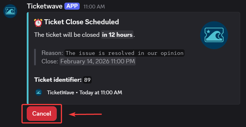 - ❌ You can cancel a scheduled close by click on the "Cancel" button in the schedule close message.